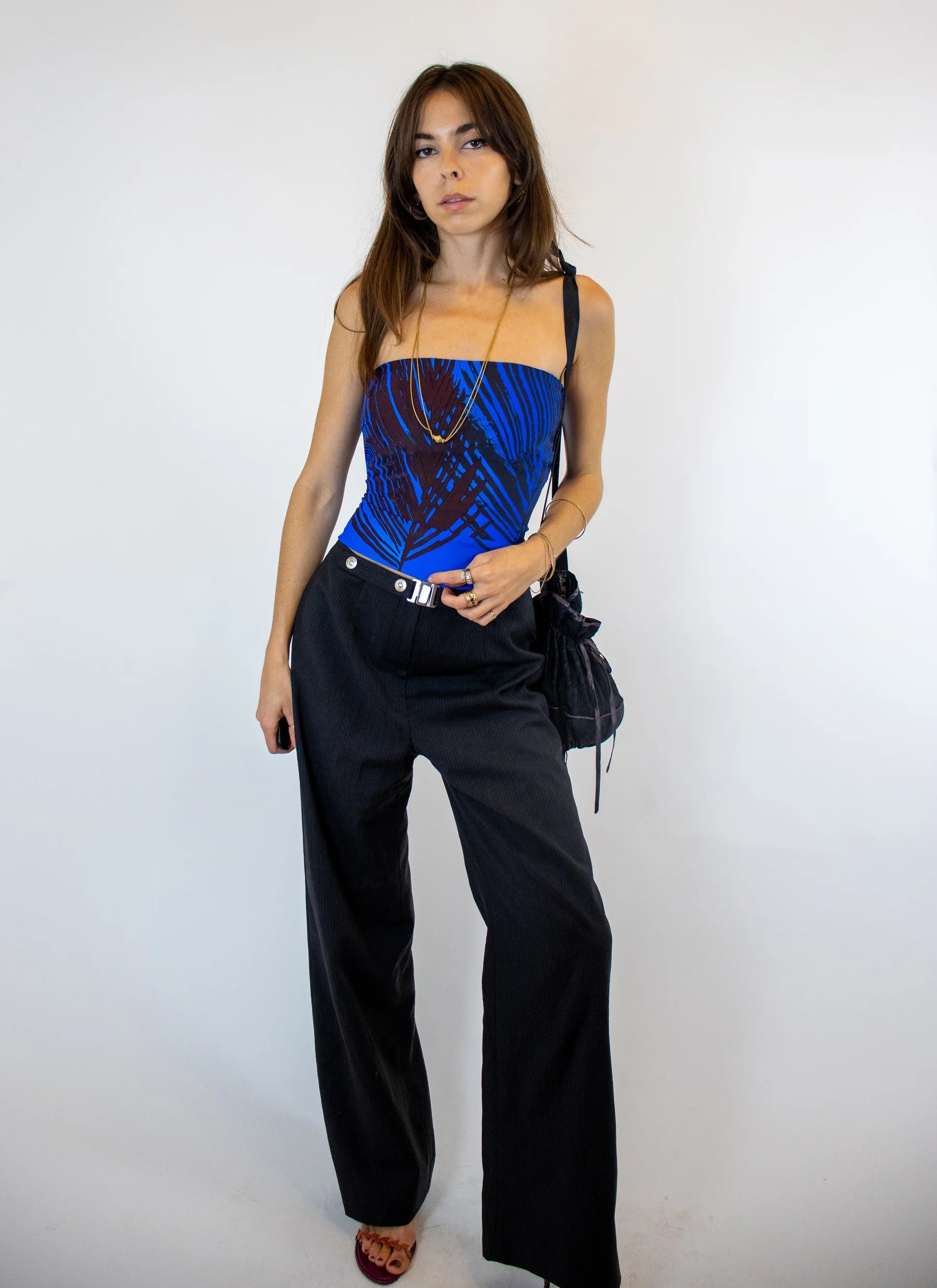 Demi Blue Top fuses Y2K style with ’70s-inspired fabric. Strapless with a straight neckline, built-in shelf bra, and fully elasticated back, she hits at the high hip for the perfect semi-cropped fit—ideal for tucking or leaving untucked.