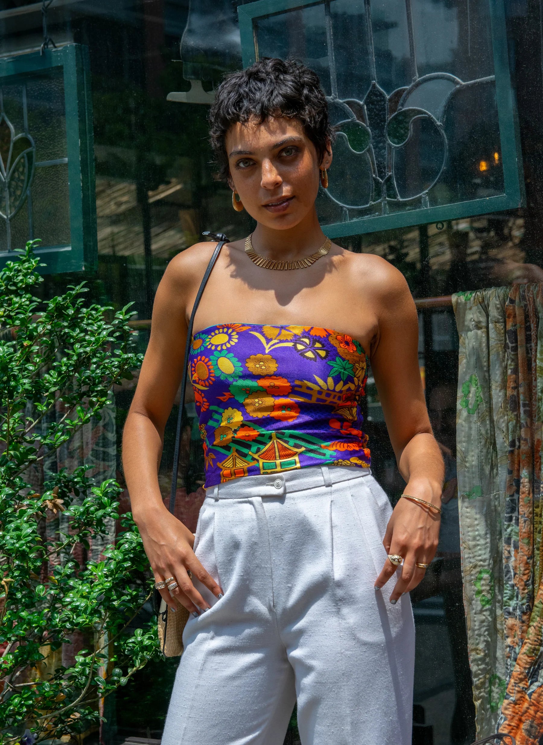 Ivanka Purple Top blends retro Y2K vibes with ’70s-inspired fabric. Strapless with a straight neckline, built-in shelf bra, and fully elasticated back, she hits at the high hip for the perfect semi-cropped fit—ideal for tucking or leaving untucked. Pair with gold jewelry and kitten heels for a standout look.